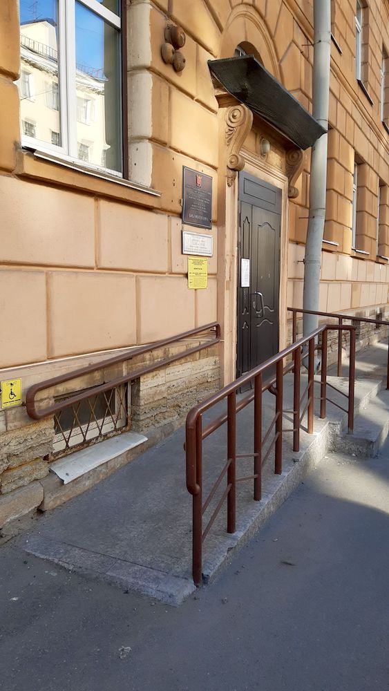 У центрального входа установлена кнопка вызова помощи, отмеченная специальной пиктограммой. Размещена информация о телефонах, на которые можно обратиться за получением помощи.